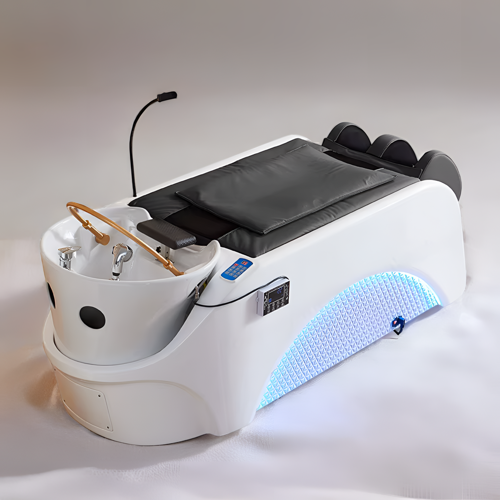 Le revêtement en cuir souple, agréable au toucher, et la structure robuste en fibre de verre offrent une assise stable et durable, parfaitement adaptée aux soins prolongés. Associé à son bac en acrylique intégré, Nami permet d’enchaîner en toute fluidité les massages, les rituels Head Spa et les soins capillaires, sans interrompre le confort du client.