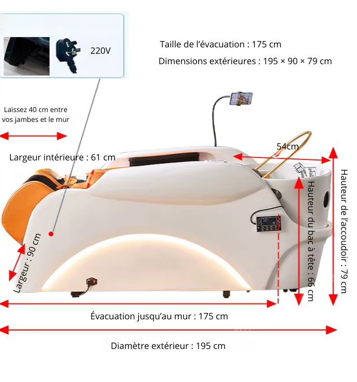 Doté d’un système avec raccordement, il garantit une alimentation en eau continue pour une utilisation sans interruption. Son design ergonomique soutient parfaitement la tête et le cou, favorisant une relaxation totale pendant le soin.